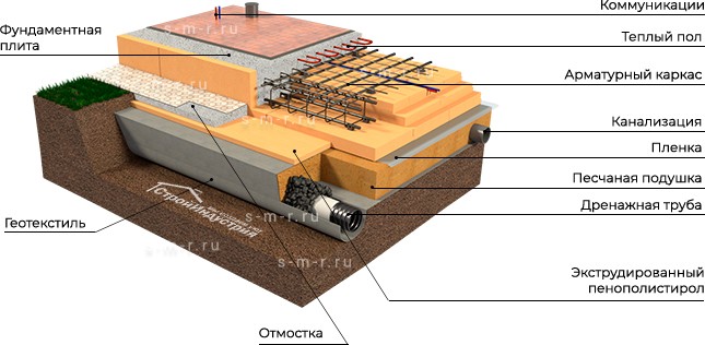 — Снижение давления на фундамент: Отведение влаги снижает давление, которое может воздействовать на плиту в результате замерзания и оттаивания почвы.